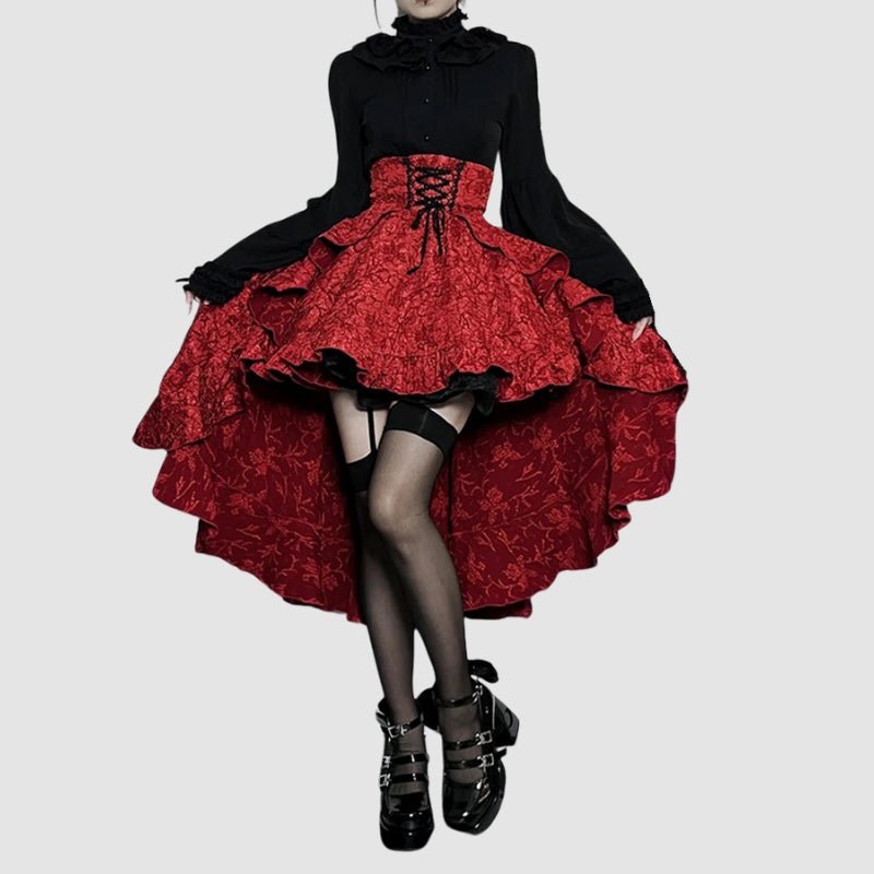 Červená Asymetrická Sukňa s Vysokým Pásom v Alternatívnom Štýle