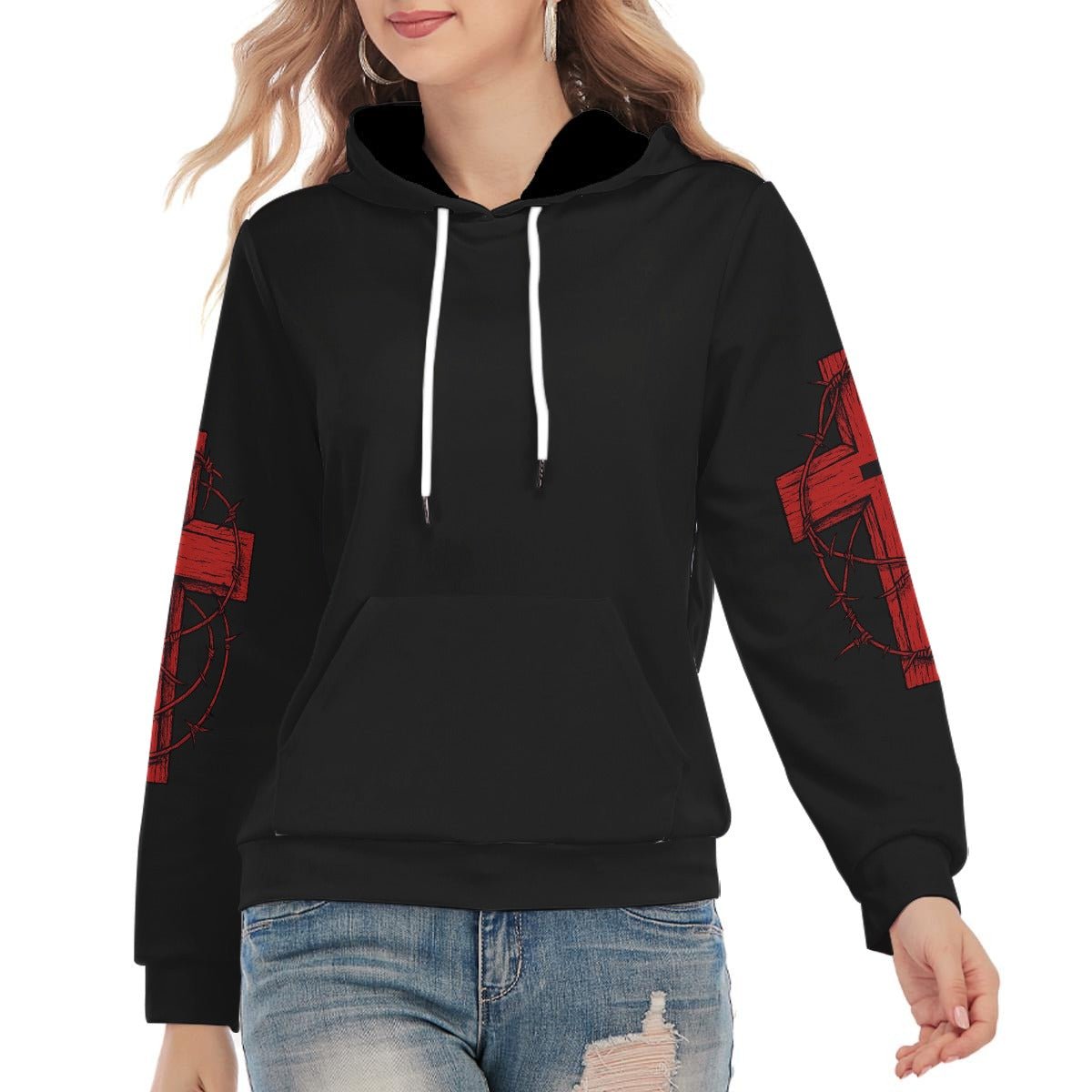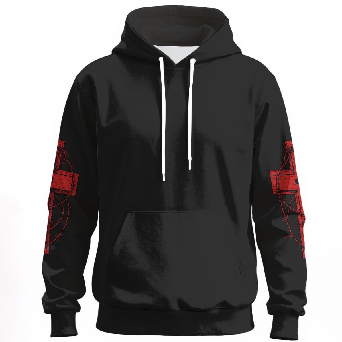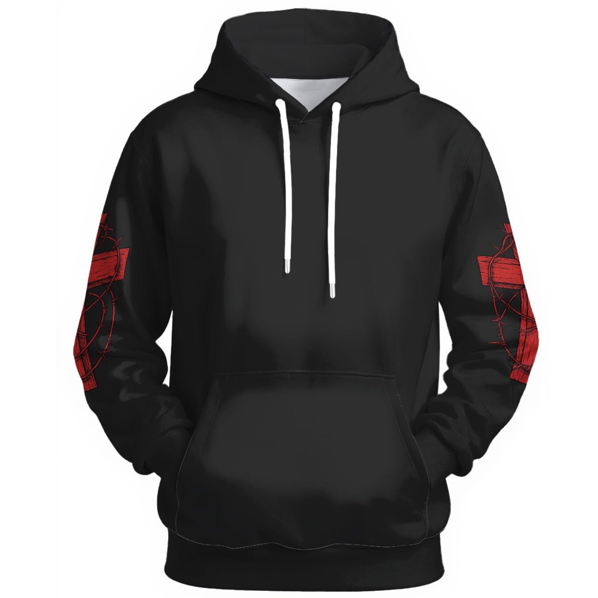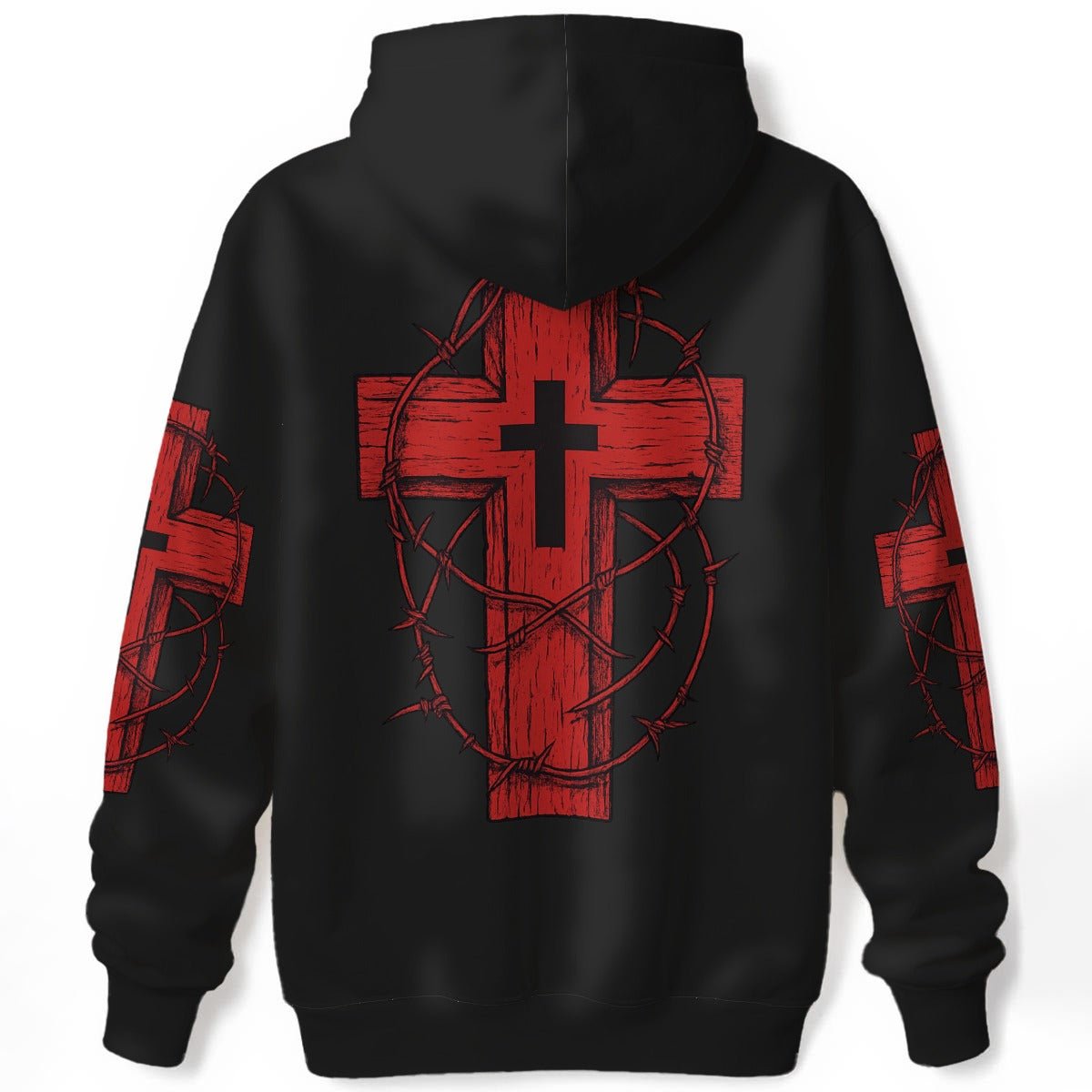Čierna mikina s červeným krížom na chrbte a tŕňovou korunou gotický motív