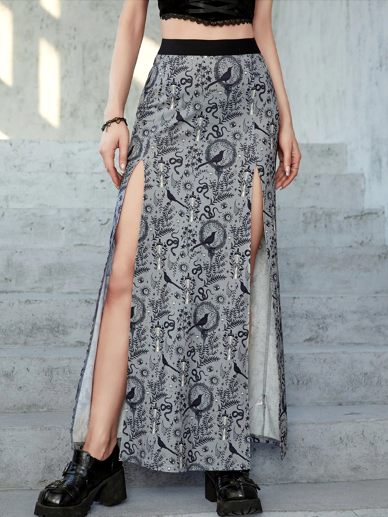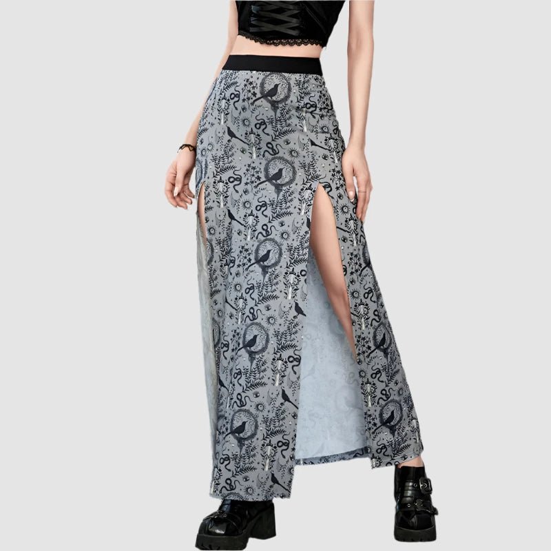 Dlhá Sivá Sukňa s Vzorom Vtákov a Hadov