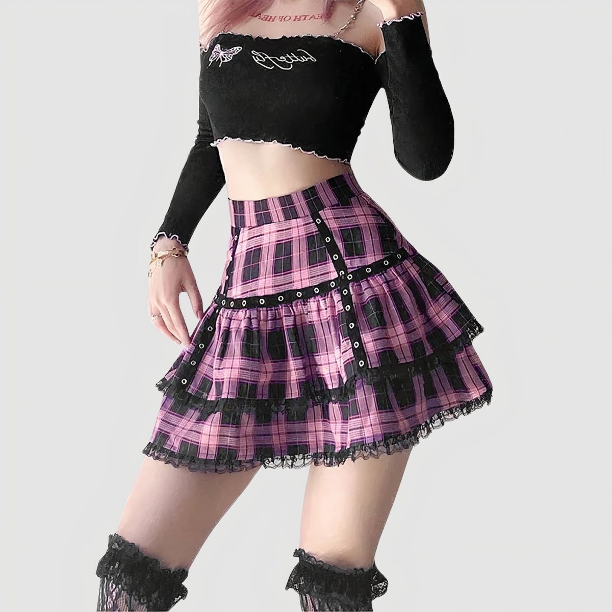 Krátka Sukňa v Kocke v Štýle Lolita Čierno-Ružová