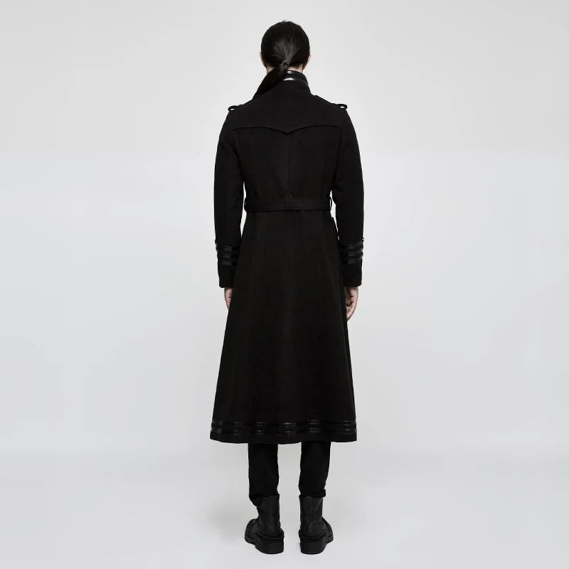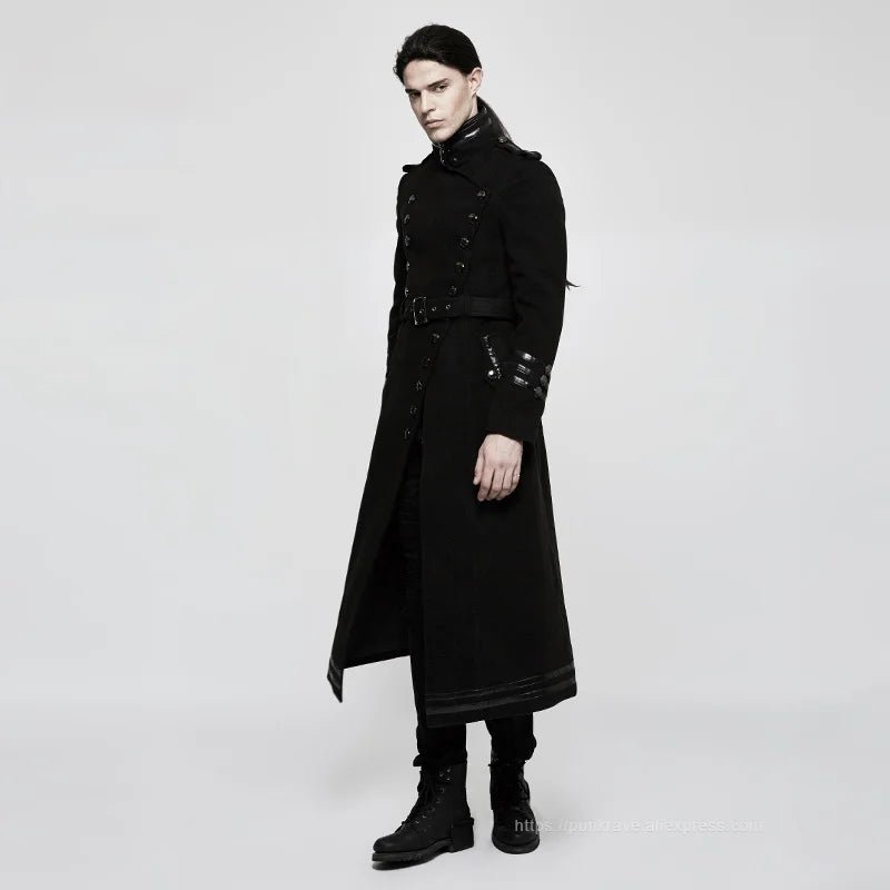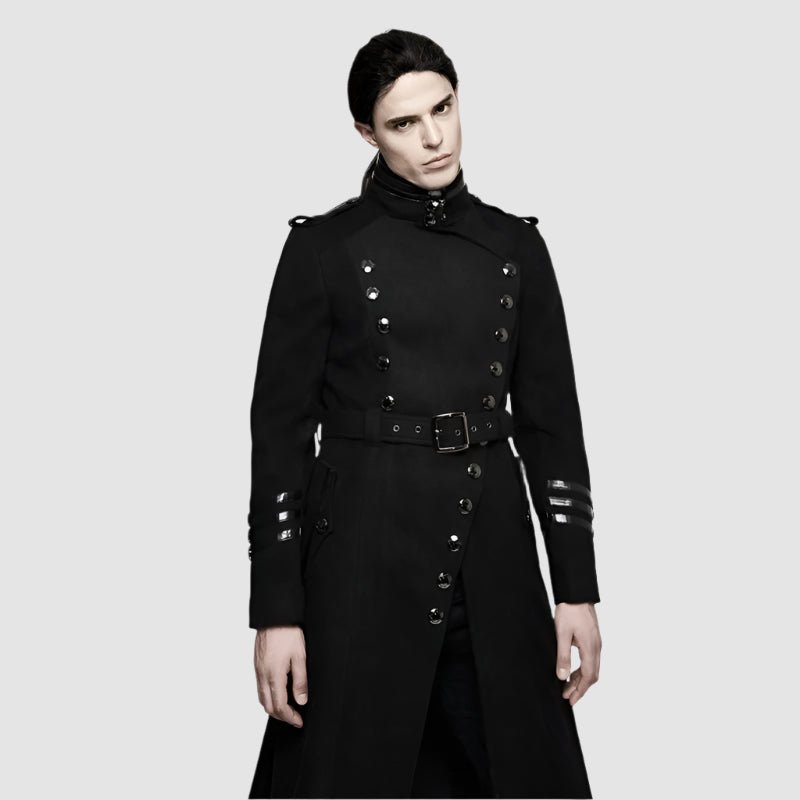 Dlhý, vojenský pánsky kabát v gotickom štýle, inšpirovaný historickými uniformami. Vyrobený z vysokokvalitného materiálu s prímesou viskózy, podšitý bavlnenou podšívkou. Zvýrazňuje postavu vďaka priliehavému strihu a ozdobnému pásu a gombíkom.